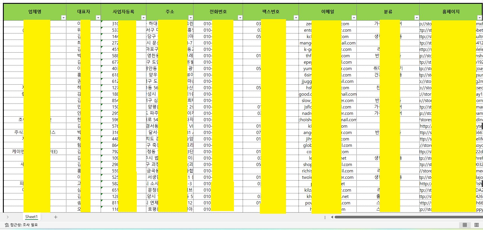 업체명 /대표자명 / 사업자 등록번호 / 주소 / 전화번호 / 팩스번호 / 이메일 / 업종 / 판매링크